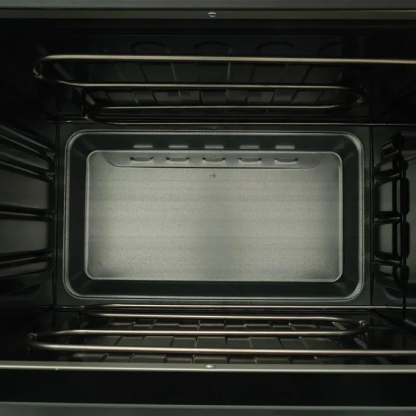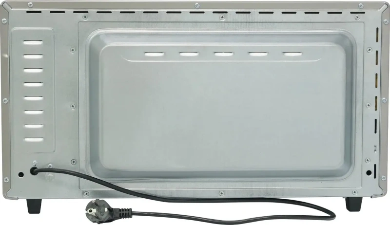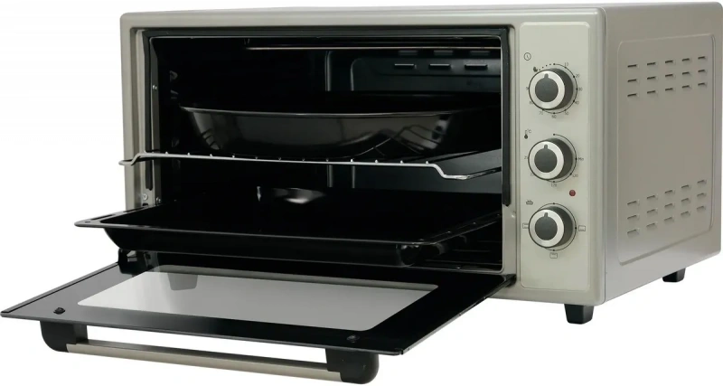 Термостойкое стекло даёт возможность контролировать ход приготовления. Внутренняя камера сделана из нержавеющей стали, которая устойчива к коррозии, перепаду температур и механическим повреждениям. Отличным подспорьем при готовке послужат: противень, решётка и круглый поднос для пиццы, идущие в комплекте. Противоскользящие ножки обеспечивают устойчивость на гладкой поверхности.