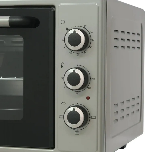 Интуитивно понятное механическое управление позволяет быстро настроить температуру, режим и время готовки. Устройство имеет три режима работы: нижний нагрев, верхний нагрев и нижний + верхний нагрев. Температура регулируется в диапазоне от 50 до 250°С. Благодаря таймеру можно установить время, необходимое для приготовления блюда. О работе мини-печи сигнализирует световой индикатор.