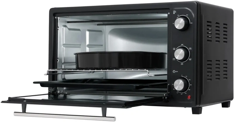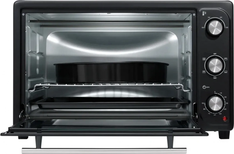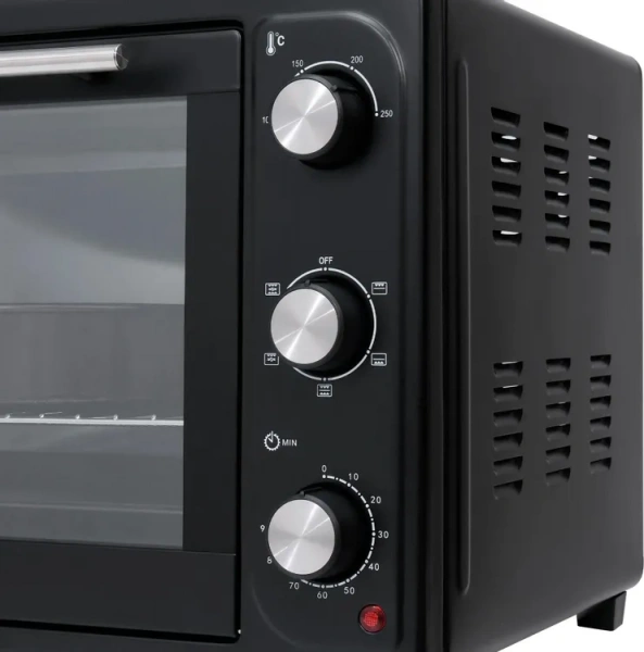 Интуитивно понятное механическое управление позволяет быстро настроить температуру, режим и время готовки. Устройство имеет пять режимов работы: нижний нагрев, верхний нагрев, нижний + верхний нагрев, верхний + конвекция, нижний + верхний + конвекция. Температура регулируется в диапазоне от 100 до 250°С. Конвекция обеспечивает равномерное распределение тепла, благодаря чему ингредиенты пропекаются равномерно. Благодаря таймеру можно установить время, необходимое для приготовления блюда. О работе мини-печи сигнализирует световой индикатор.