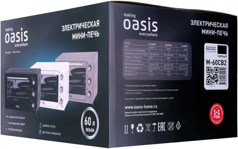 Электрическая мини-печь making Oasis everywhere M-60CB2 – компактный кухонный прибор, идеально подходящий для небольшой кухни. Эта модель позволяет без дополнительных усилий запечь картофель или курицу с хрустящей корочкой. Полезный рабочий объём составляет 60 литров. Лаконичный дизайн в чёрном цвете гармонично вписывается в современный интерьер.