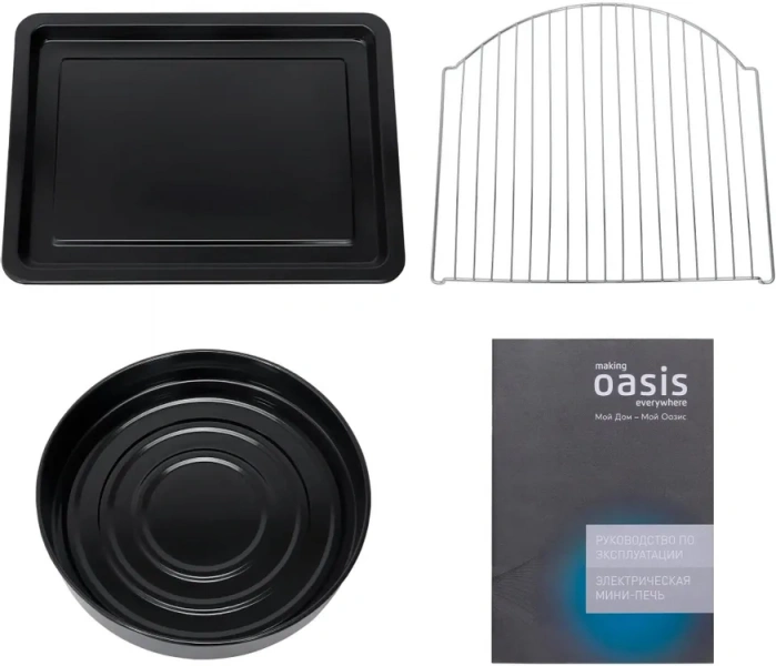Двойное термостойкое стекло не допускает теплопотерь внутри камеры и даёт возможность контролировать ход приготовления. Внутренняя камера сделана из оцинкованной стали, которая устойчива к коррозии и перепаду температур. Отличным подспорьем при готовке послужат: противень, решётка и круглый поднос для пиццы, идущие в комплекте. Мини-печь making Oasis everywhere – отличный выбор для любителей домашней еды.