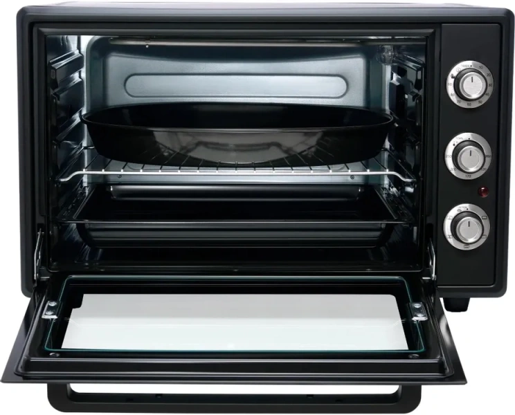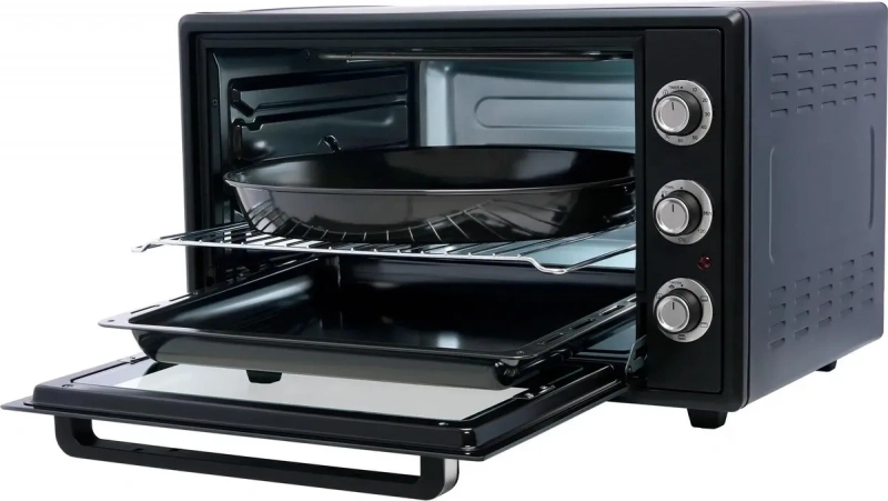 Интуитивно понятное механическое управление позволяет быстро настроить температуру, режим и время готовки. Устройство имеет пять режимов работы: нижний нагрев, верхний нагрев, нижний + верхний нагрев, верхний + конвекция, нижний + верхний + конвекция. Температура регулируется в диапазоне от 50 до 250°С. Конвекция обеспечивает равномерное распределение тепла, благодаря чему ингредиенты пропекаются равномерно. Благодаря таймеру можно установить время, необходимое для приготовления блюда. О работе мини-печи сигнализирует световой индикатор.
