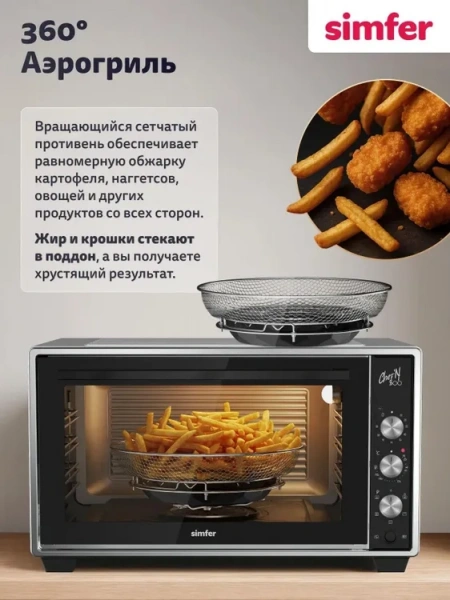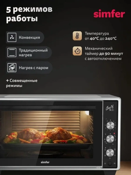Мини-печь Simfer M50C25 объемом 50 литров и мощностью 1400 ватт. Имеет 5 режимов, в том числе конвекцию и гриль.