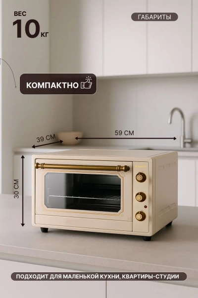 Мощность: 1800 Вт Внутренний объем духовки: 48 л Внутреннее покрытие: нержавеющая сталь Материал корпуса: металл Минимальная температура: 50 °C Максимальная температура: 250 °C Количество режимов работы: 3 Режимы приготовления: верхний нагрев, верхний + нижний нагрев, нижний нагрев Тип управления: механическое Таймер на 90 минут Термоизолированный корпус Ручка с защитой от нагревания Индикатор работы, звуковой сигнал Комплектация: круглый противень, решетка Страна-производитель: Турция