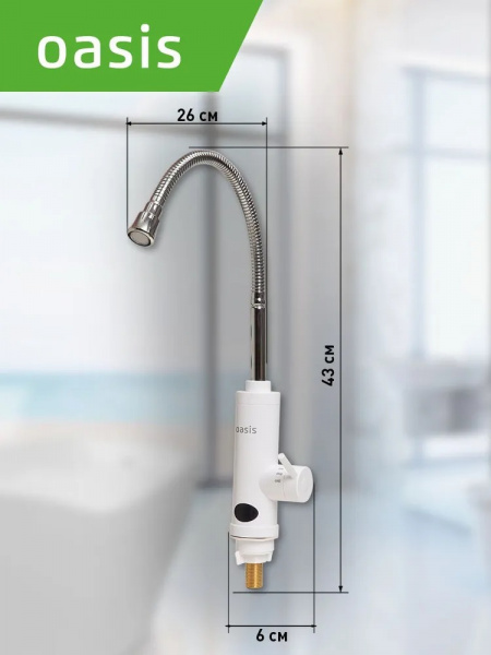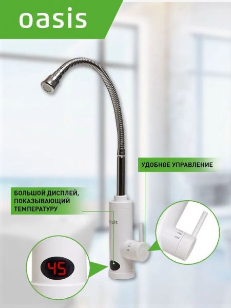Водонагреватель электрический Oasis GP-W с нагревательным элементом мощностью 3.3 кВт способен при открытии крана подавать воду с температурой до 60 °C. Гибкий излив обеспечивает простую регулировку положения. Все детали выполнены из прочных и безопасных материалов.