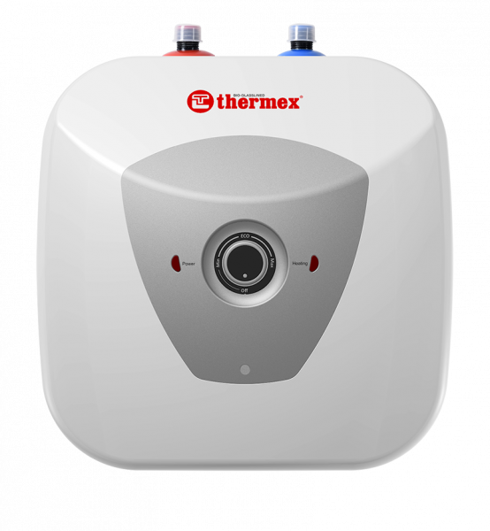 Электроводонагреватель Thermex H 10 U (pro) представляет собой емкость объемом 10 литров, состоящую из двух баков, вложенных друг в друга. Поверхность внутреннего стального бака покрыта специальным стеклофарфоровым покрытием, защищающим от коррозии и тем самым продлевающим срок службы бойлера. В эту емкость сверху вмонтированы два патрубка. Один (с синим кольцом) — для впуска холодной воды. Второй (с красным кольцом) — для выхода нагретой горячей воды. Нагрев воды внутри бака производится при помощи расположенных там трубчатых электронагревателей (ТЭНов), управляемых капиллярным термостатом.
