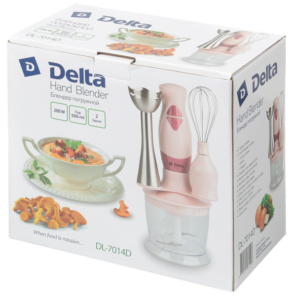 | Особенности | Delta DL-7014D — простой в использовании блендер с двумя скоростными режимами работы. С его помощью можно очень быстро измельчить овощи или орехи, смешать коктейль, взбить сливки или приготовить крем-суп. |