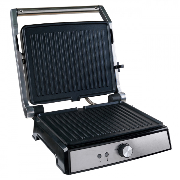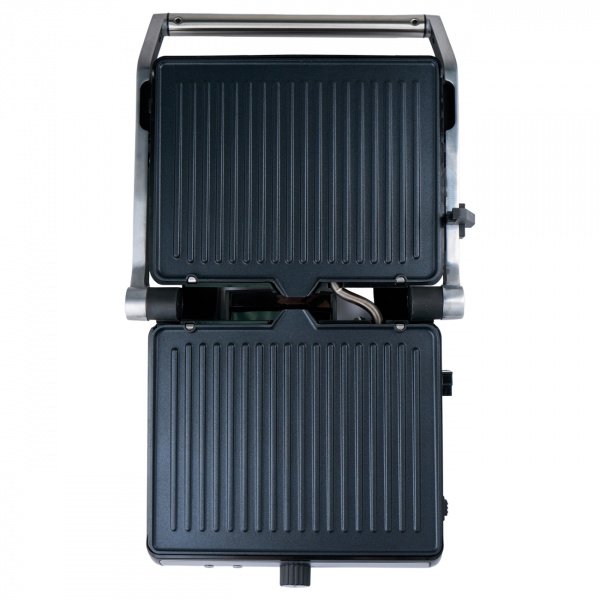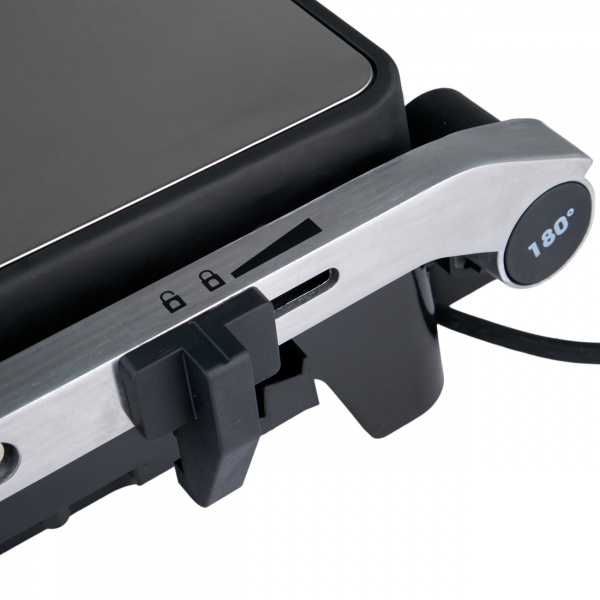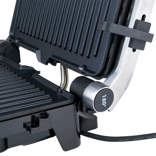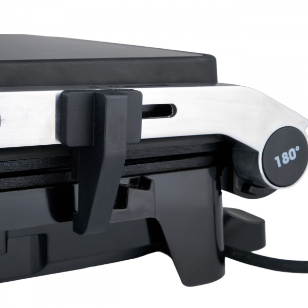 Рабочая поверхность гриля раскрывается на 180°, что позволяет готовить на двух панелях одновременно. Это удобно для приготовления овощей, мяса или морепродуктов для барбекю. Можно готовить бургеры: на одной панели обжарить котлеты, а на другой — булочки. Устройство может использоваться как пресс-гриль для обжаривания мяса, рыбы или овощей с двух сторон.