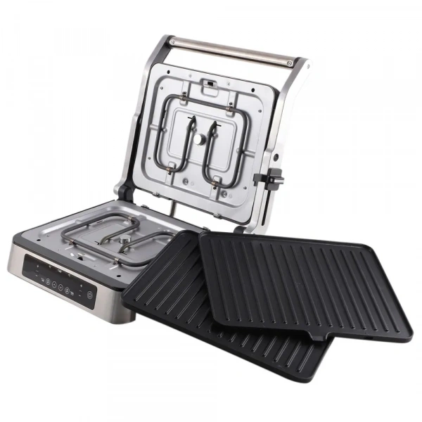 Теплоизолированная ручка не даёт обжечься при готовке. Сенсорное управления удобное и простое. Индикатор показывает, когда панели нагрелись и готовы к работе. Антипригарное покрытие защищает от пригорания пищи и легко очищается. Для жира, которое выделяет мясо, есть съёмный поддон, который удобно мыть.