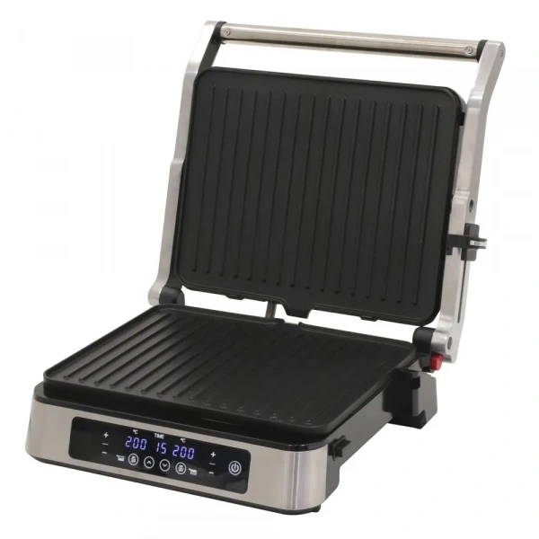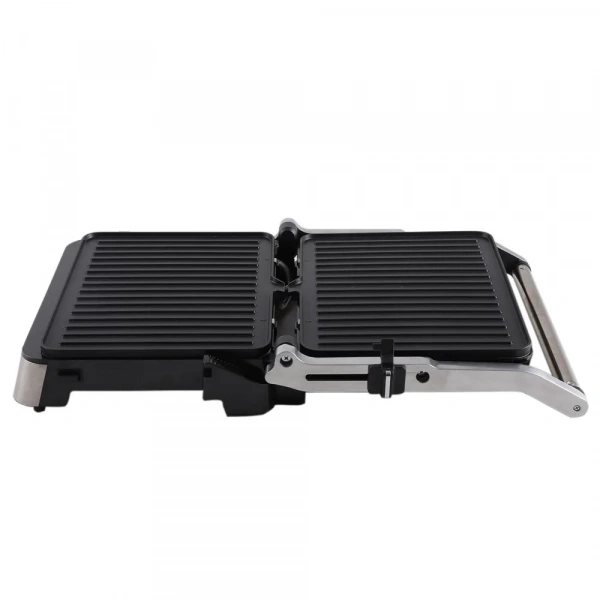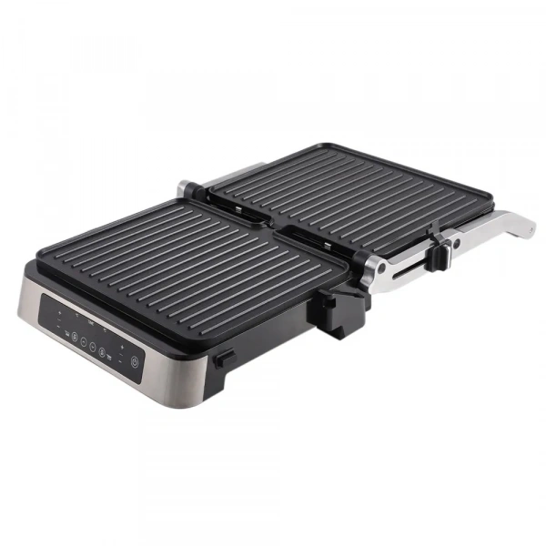 Рабочая поверхность гриля раскрывается на 180°, что даёт возможность готовить сразу на двух панелях. Таким образом можно жарить овощи, мясо или морепродукты для барбекю-вечеринки. Или делать бургеры: на одной стороне жарить котлеты, а на другой подрумянивать булочки. В качестве пресс-гриля устройство подходит для обжаривания мяса, рыбы или овощей с двух сторон, либо приготовления горячих сэндвичей.