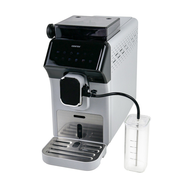 Centek - комфорт в каждом уголке вашего дома! Кофемашина CT-1191 — ваш верный спутник в мире кофе! Эта автоматическая кофемашина станет идеальным выбором для настоящих гурманов, ведь она оснащена встроенной жерновой кофемолкой, которая предлагает 15 уровней помола зёрен. Насладитесь свежестью и разнообразием вкусов с зерновой кофемашиной, чтобы каждый глоток был настоящим наслаждением. С помощью сенсорного управления вы можете выбрать один из 10 режимов работы и отрегулировать степень помола, порцию воды, а индикация сообщит вам о режиме работы и необходимости очистки отсека для отходов. Давление 15 бар 1450 Вт гарантируют идеальный эспрессо, а автоматическая система вспенивания молока позволит вам готовить капучино и латте с идеальной пенкой. Контейнеры объёмом 2000 мл (2 л) для воды и 250 мл (0.25 л) для молока дают возможность готовить множество чашек без частой дозаправки. А ёмкость на 150 грамм зёрен является дополнительным преимуществом для приготовления нескольких порций вашего любимого напитка. Кнопка регулировки высоты стакана позволяет настроить параметры в зависимости от предпочтений и размера чашки. Кофемашинка с автоматическим капучинатором и кофемолкой делает приготовление любимых кофейных напитков ещё более простым и удобным. Функция автоотключения через 28 минут экономит электроэнергию и обеспечивает безопасное использование. Высоконапорная итальянская помпа Ulka кофемашины обеспечивает быстрое приготовление насыщенного кофе с полным вкусом каждого зёрнышка. Отлично заменит кофеварку электрическую и рожковую кофеварку Не упустите возможность стать обладателем автоматической зерновой кофемашины и наслаждаться неповторимым вкусом кофе каждый день! Большая кофемашина для дома идеальна для любителей свежезаваренного кофе и станет отличным дополнением к вашему кухонному оборудованию. С кофемашинами зерновыми автоматическими вы сможете без труда приготовить как крепкий эспрессо, так и воздушное капучино — наслаждайтесь вкусом любимого кофе в любое время!