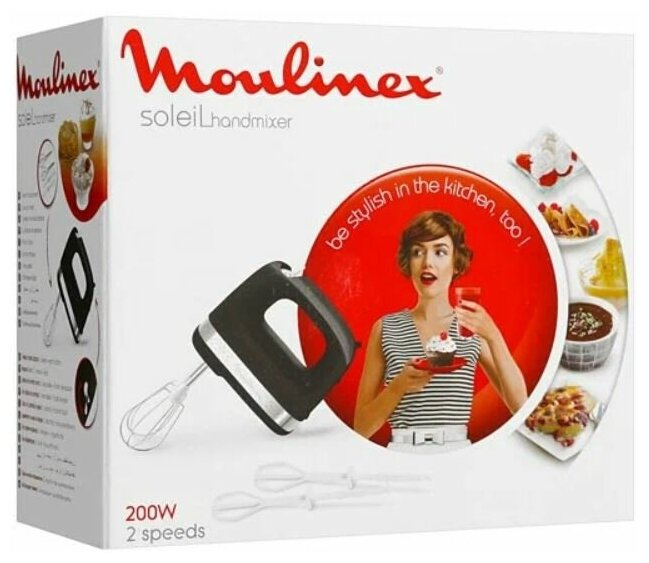 Прибор Moulinex Soleil HM211810 оснащен двумя скоростями, достаточными для быстрого и эффективного смешивания продуктов. Вы можете использовать любую подходящую для замешивания чашу. Устройство весит всего 783 г и обладает размерами 9x15x16.5 см.