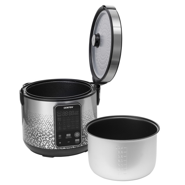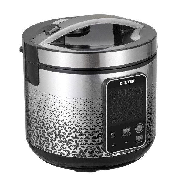 Чаша с антипригарным покрытием объемом 5 литров и компактный корпус мультиварки из металла и пластика просты в уходе. Прибор имеет 25 программ, что позволит выбрать оптимальный режим приготовления для каждого блюда. Вы сможете приготовить в мультиварке детское питание, кашу, суп, йогурт, потушить или пожарить овощи и мясо или испечь пирог. Мультиварка Centek CT-1499 оснащена электронным управлением, благодаря чему вы легко установите необходимую программу. Функция «Мультиповар» позволяет устанавливать время и температуру приготовления того или иного блюда вручную. Также есть таймер отсрочки старта продолжительностью до 24 часов. Мультиварка мощностью 900 Вт обеспечит быстрое приготовление пищи. После окончания приготовления можно воспользоваться функцией поддержания температуры в чаше.