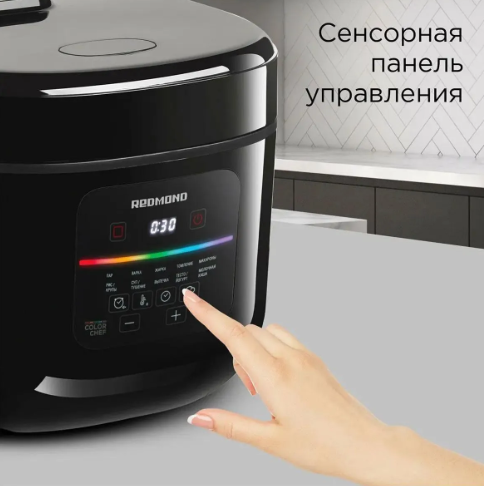 Управляйте устройством, нажимая сенсорные кнопки. Они не застревают, а за панелью легко ухаживать: просто протирайте ее иногда влажной тканью. Все значки крупные и яркие, а названия программ написаны по-русски, так что вам будет легко освоить мультиварку и радовать близких самыми вкусными блюдами.
