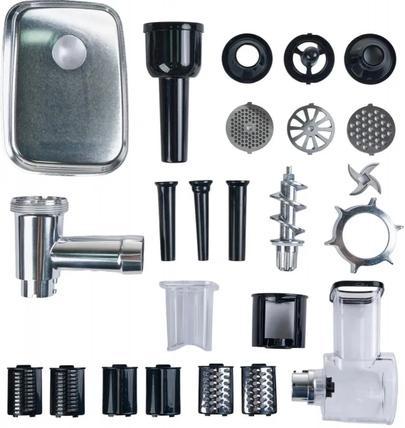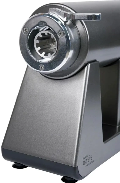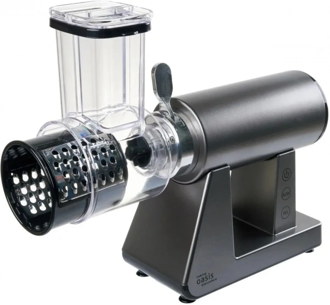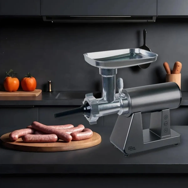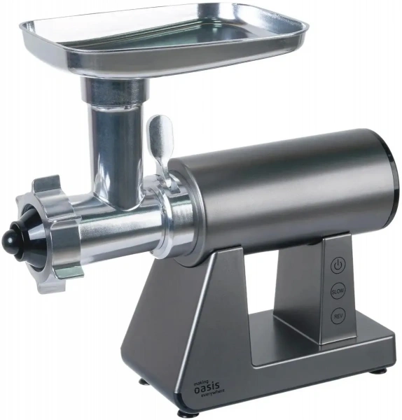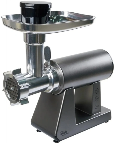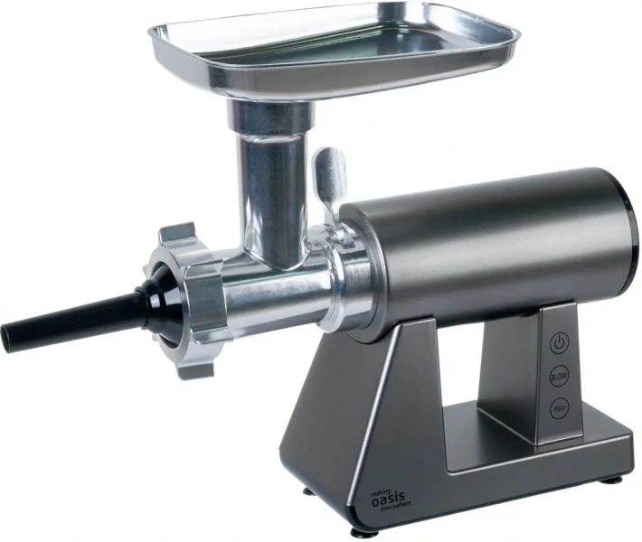 Электромясорубка Oasis MG-DM1 работает с мощностью 2500 Вт, что обеспечивает приготовление со скоростью 1,5 кг/мин. Уровень шума при работе равен 60 дБ. Установлены два скоростных режима и реверс. В комплект входят восемь насадок, в том числе насадка-овощерезка, для приготовления колбасы, насадка кеббе и самозатачивающийся нож из нержавеющей стали.