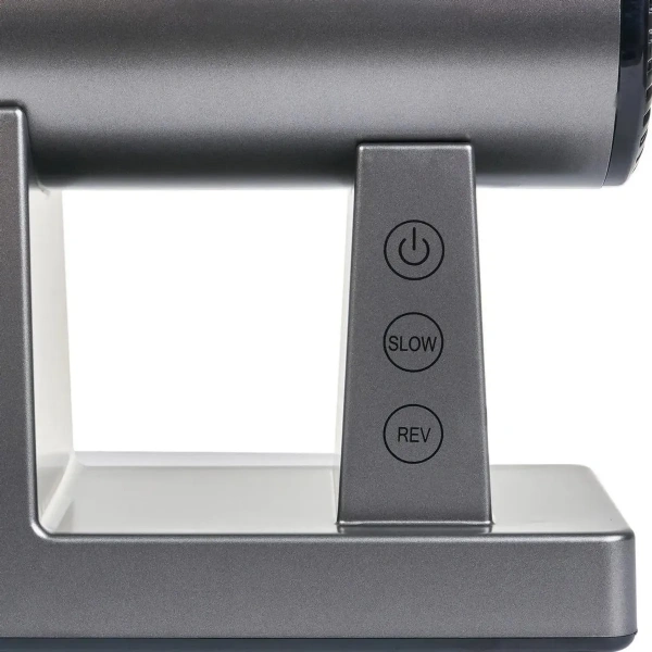 Корпус серо-черного цвета выполнен из пластика, оборудован противоскользящей поверхностью и прорезиненными ножками. Материал лотка и шнека — металл. В случае перегрева устройство автоматически отключается. Габаритные размеры — 35х35,5х17 см. Вес — 4,3 кг. Срок службы — 3 года.