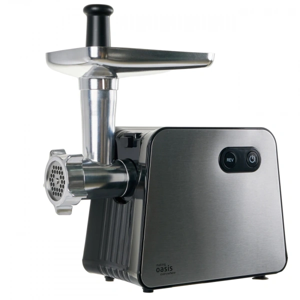 Мясорубка making Oasis everywhere – это кухонный прибор, предназначенный для переработки мяса в фарш. Также подходит для измельчения овощей, фруктов и других видов продуктов. Три перфорированных диска позволяют сделать фарш разного помола, благодаря отверстиям разного диаметра. А с помощью дополнительных насадок можно сделать домашние колбаски и кеббе. Устройство имеет реверсивный режим, который меняет направление движения шнека, для быстрой очистки мясорубки. Для предохранения двигателя от поломки при долгой работе, есть защита от перегрева. Самозатачивающийся нож повышает срок эксплуатации устройства без замены деталей. Конструкция алюминиевого замка позволяет зафиксировать головку мясорубки одним поворотом. Удобные и понятные клавиши управления обеспечивают комфорт в работе с прибором. Высокая производительность позволяет обработать большое количество мяса за один раз.