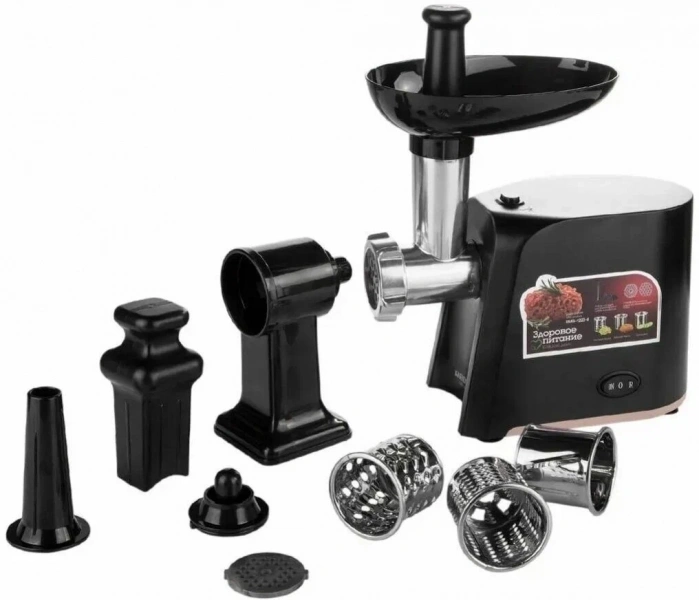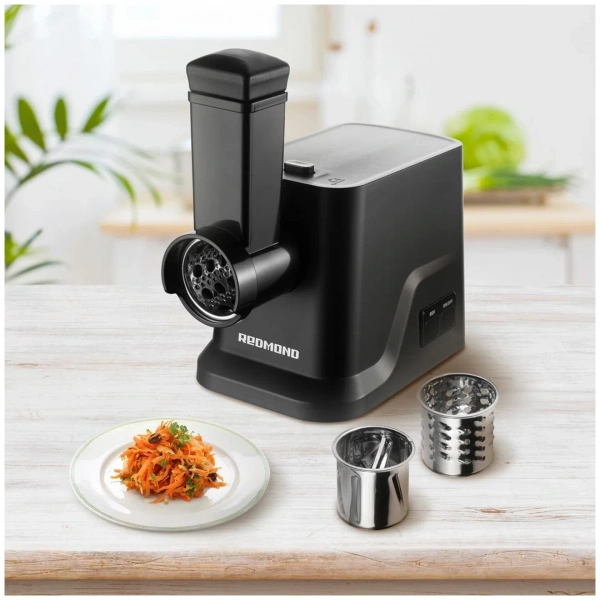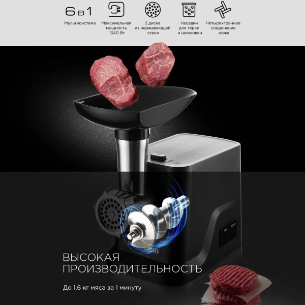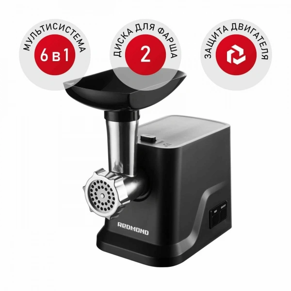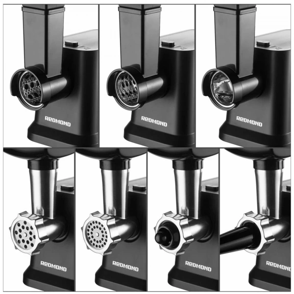 Мясорубка РЕДМОНД RMG-1239-6 – это многофункциональный кухонный прибор «6 в 1», с помощью которого вы сможете быстро не только перемолоть мясо, но и подготовить ингредиенты для салатов, супов, мясных и рыбных блюд или сделать домашние колбаски и кеббе.