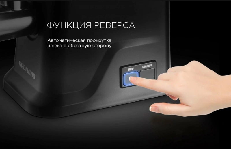 При обработке жесткого мяса с жилами механизм мясорубки может замедлиться или застопориться. Чтобы не разбирать мясорубку, используйте режим реверса, при котором шнек вращается в обратную сторону, перемещая содержимое блока устройства к загрузочному отверстию. Затем включите обычный режим – шнек разобьет образовавшийся комочек.