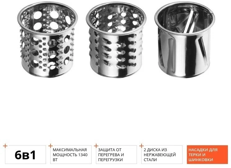 В комплект RMG-1239-6 входят крупная терка, терка для приготовления драников, а также шинковка. С их помощью вы сможете быстро нашинковать овощи для супа, нарезать салат, измельчить чеснок или натереть сыр.