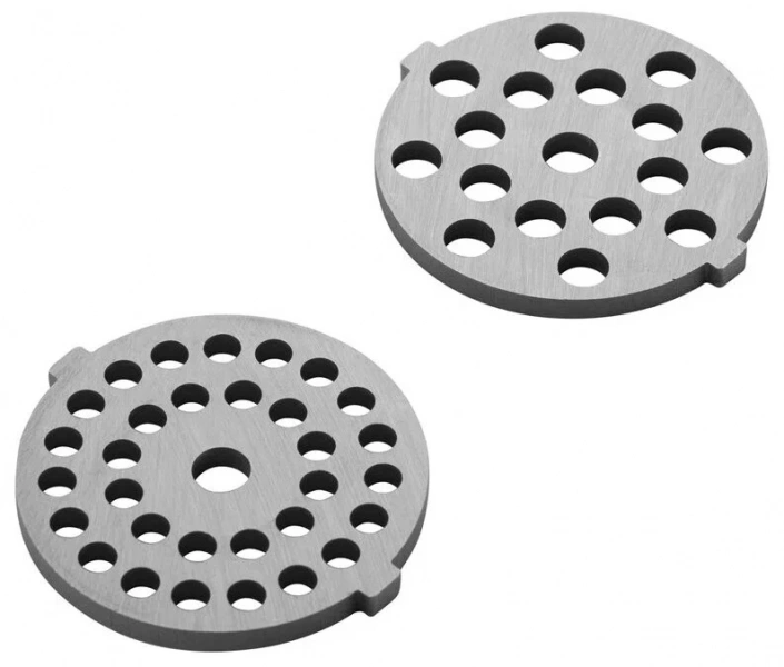 В комплект RMG-1239-6 входят 2 диска из высококачественной нержавеющей стали для приготовления фарша разного помола. Для домашних тефтелей, рыбных и овощных котлет подойдет насадка для крупного фарша с отверстиями 7 мм. Более мелкая перфорация – 5 мм –используется для приготовления домашней ветчины или паштета.