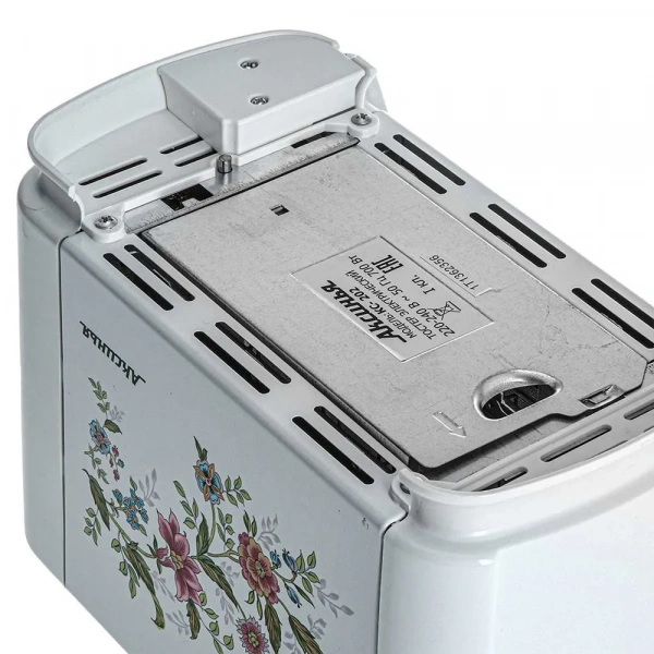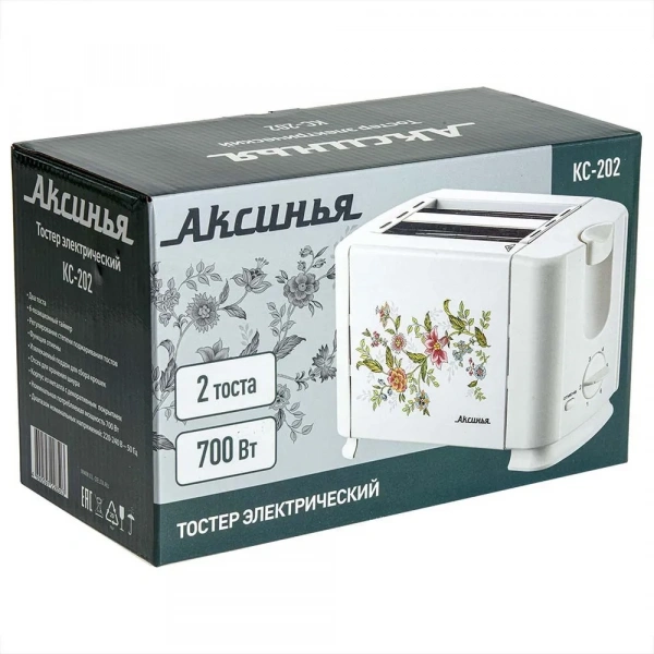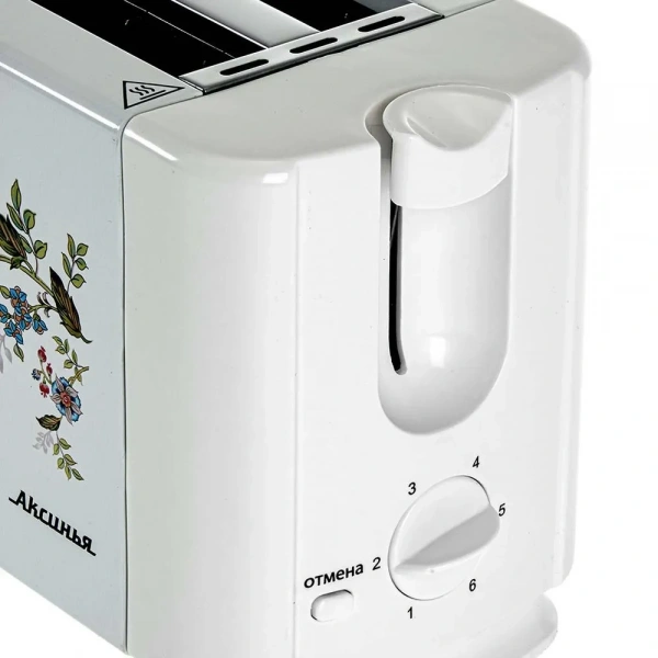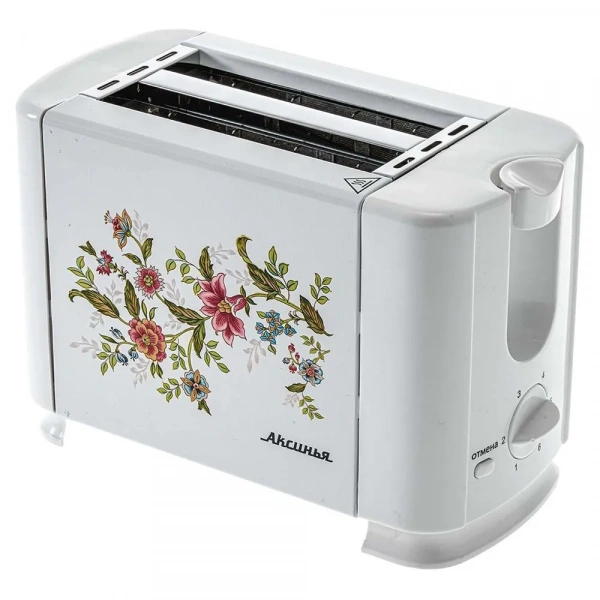 Тостер Аксинья КС-202 Прованс выполнен в белом металлическом корпусе с цветочным рисунком. В модели установлены 2 отделения для приготовления тостов. Механизм автоматического выброса выталкивает ломтики хлеба после завершения программы. На панели управления тостера Аксинья КС-202 Прованс расположены механический поворотный регулятор для выбора степени обжаривания из 6 положений и кнопка отмены приготовления. Извлекаемый поддон собирает крошки и прост в очистке. В конструкции прибора предусмотрен отсек для хранения сетевого шнура.