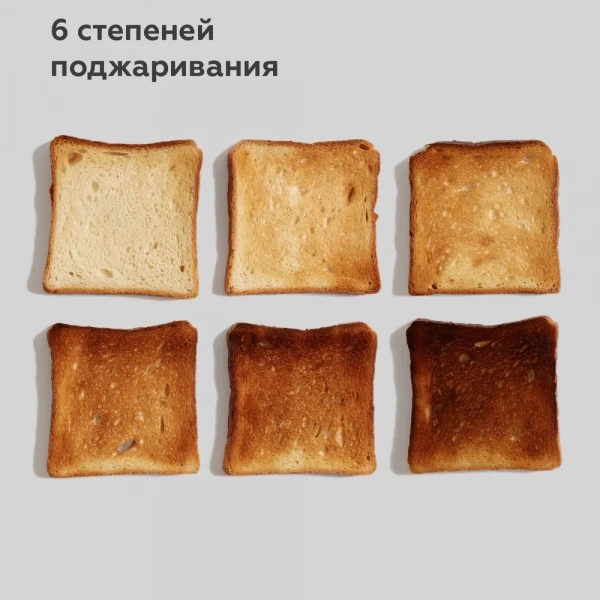 Тостер предлагает шесть режимов поджаривания, что позволяет выбрать идеальный уровень готовности в зависимости от ваших предпочтений. Удобная функция отмены дает возможность мгновенно прекратить процесс, если тосты уже достигли желаемой степени поджаривания.
