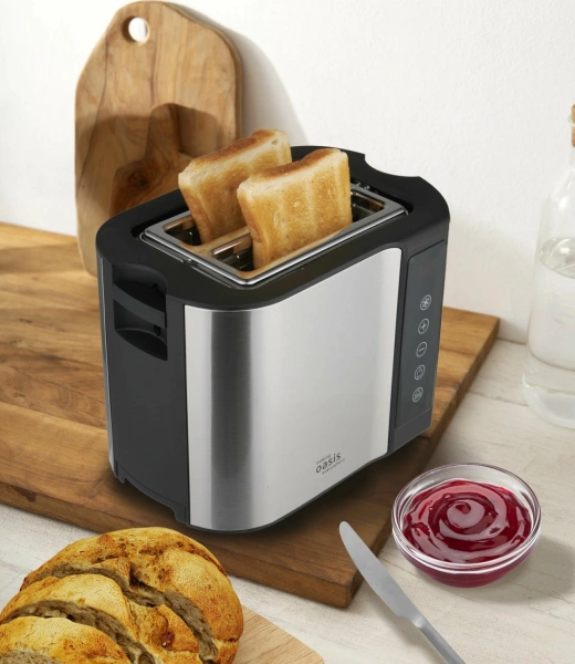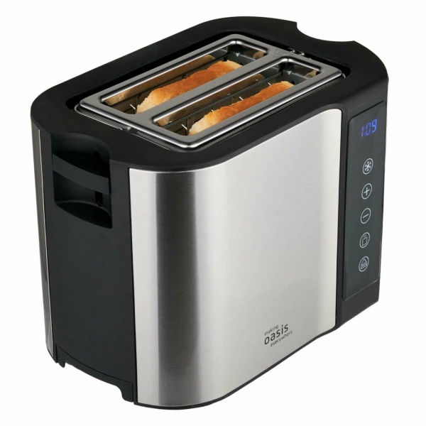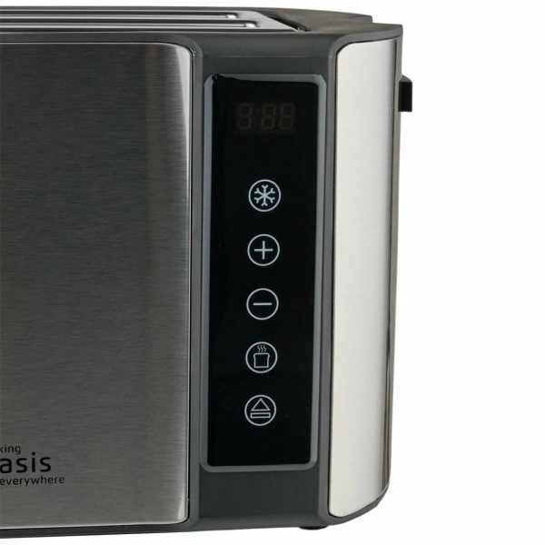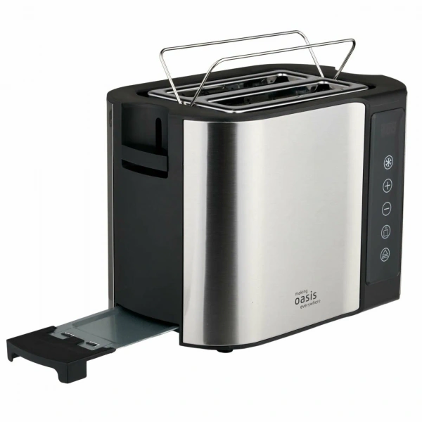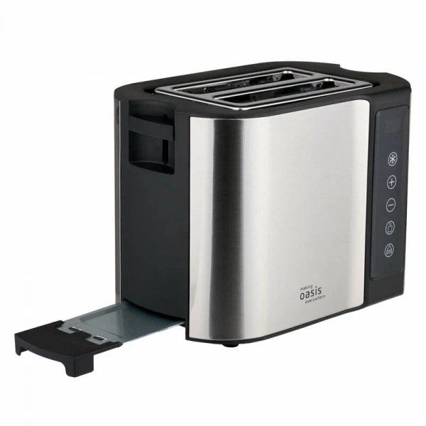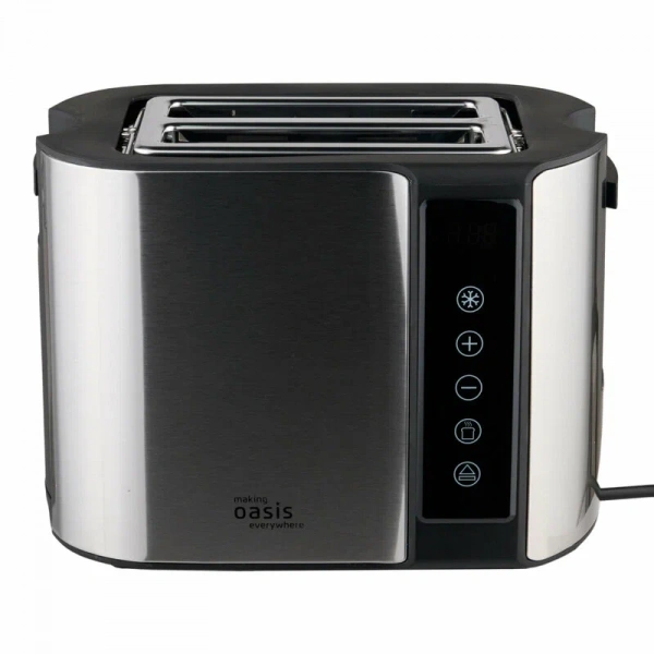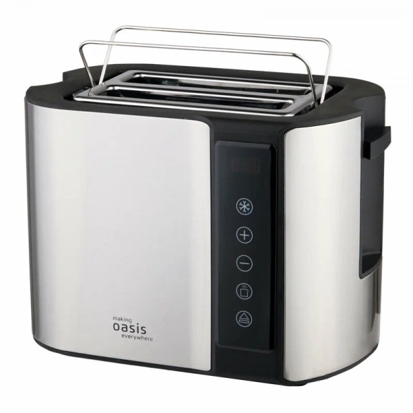 Тосты хорошо сочетаются с большим количеством продуктов, что даёт простор для фантазии в выборе начинки. Также они легче усваиваются организмом, что делает их полезнее обычного мучного хлеба. Полезен большой набор функций тостера. С несколькими уровнями обжарки получаются как мягкие, так и более хрустящие тосты. Функция подогрева равномерно разогревает хлеб, не пересушивая его. Специальная стойка позволяет разместить изделия, не предназначенные для тостера, например булочки или круассаны. Тостер making Oasis everywhere может не только готовить тосты, но и предварительно размораживать их. Обратный отсчёт времени показывает, сколько осталось времени до окончания работы. Функция Отмены останавливает работу тостера, если что-то пошло не по плану. Корпус тостера изготавливается из металла с пластиковыми вставками. С функцией автоотключения не нужно следить за процессом готовки. Автоматический выброс позволяет удобно и безопасно достать тосты. Оборудованный поддон для крошек делает очистку простой и быстрой. Благодаря выдвижному поддону легко доставать крошки, которые осыпаются с хлеба. Отзывчивое сенсорное управление и яркий дисплей создают комфорт в работе с устройством. Преимущества: Подставка для разогрева булочек Выдвижной поддон для крошек Регулировка степени обжаривания Центрирование и экстра-подъем тостов Компактность и мобильность Характеристики: Мощность: 800 Вт Тип управления: сенсорный Число слотов: 2 Количество уровней обжаривания: 7 Регулировка степени обжаривания: да Центрирование и экстра-подъем тостов: да Обратный отсчет времени поджаривания: да Функция размораживания: да Функция разогрева: да Функция Отмена: да Автоотключение: да Термоизолированный корпус: да Дисплей: да Подставка для разогрева булочек: да Выдвижной поддон для крошек: да Материал корпуса: металл, пластик Класс защиты: I Параметры электросети: 220-240 В, 50-60 Гц Размеры (ВхШхГ): 19.5х26x18.2 см Вес: 1.45 кг Цвет: серебристый Комплектация: Тостер Инструкция по эксплуатации Гарантийный талон
