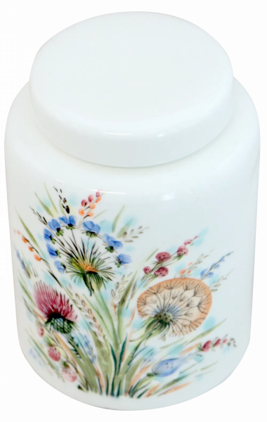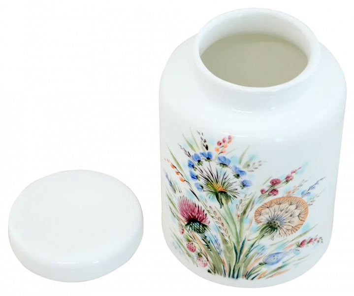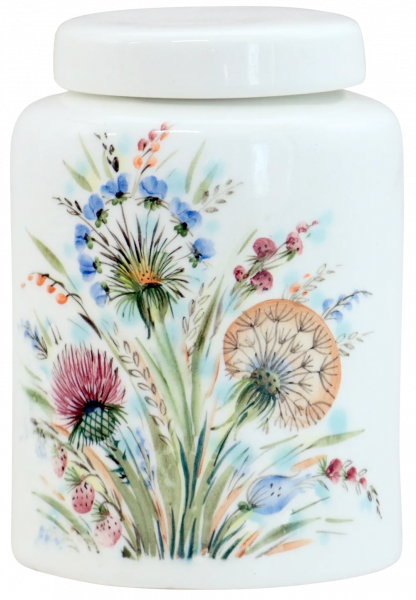 Банка "Степной букет Татарник" выглядит очень нежно. Изделие декорировано подглазурной росписью, с изображением татарника и донских цветов. Станет замечательным и желанным подарком для любой хозяйки.