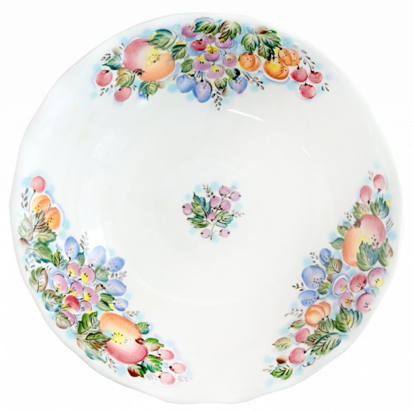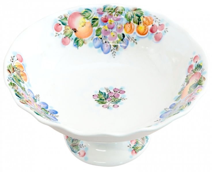 Милая фруктовница "Сад" идеально дополнит праздничную сервировку стола. Декорировано изделие яркой подглазурной росписью с изображением спелых ягод и фрутков.
