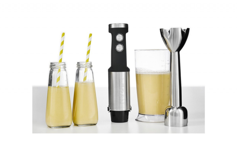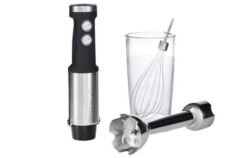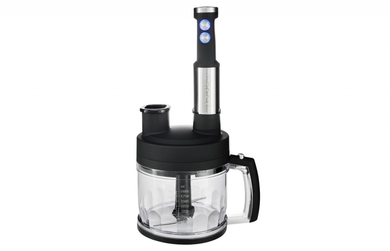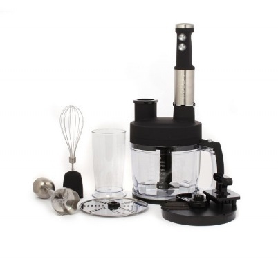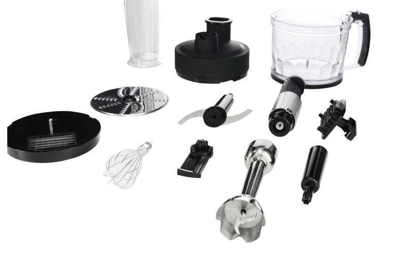 Мощность составляет 1200 Вт, благодаря чему блендер легко справляется с колкой люда и измельчением даже замороженных овощей и мяса. В комплект входит мини-процессор с насадкой для нарезки кубиками, шинковкой, теркой и измельчителем. Есть так же насадка для приготовления пюре, венчик для взбивания и мерный стакан.