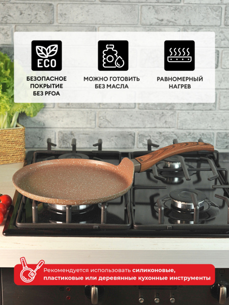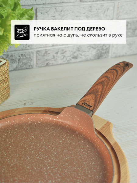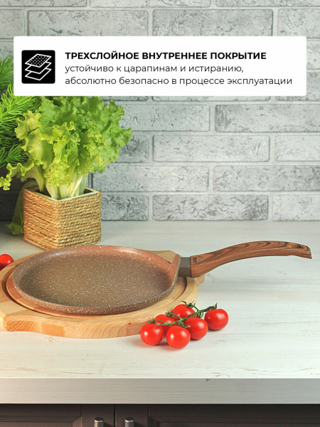 Трехслойное внутреннее покрытие устойчиво к царапинам и истиранию, абсолютно безопасно в процессе эксплуатации. Ручка с мягким силиконовым покрытием, имитирующим древесную фактуру, не нагревается и не скользит. Идеально подходит для приготовления низкокалорийных блюд или для жарки и тушения с минимальным количеством масла. Для всех типов плит, в том числе индукционных.