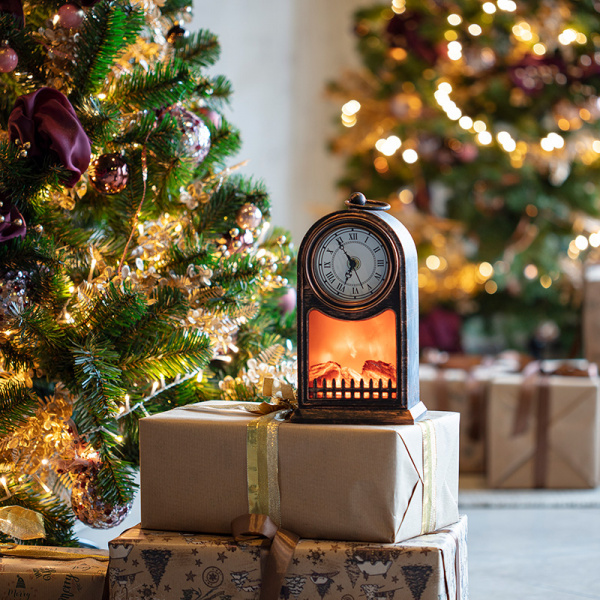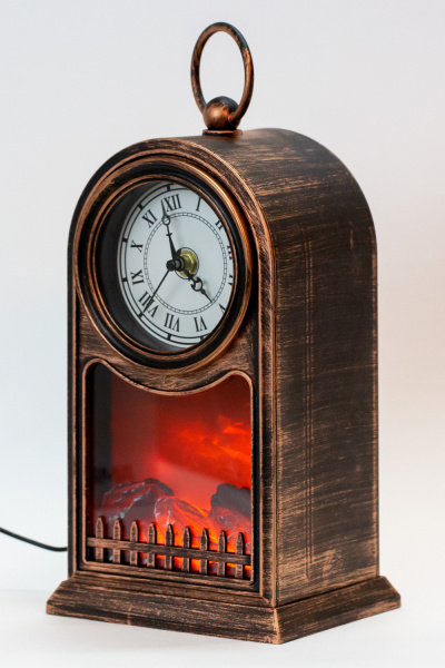 Светодиодный камин с эффектом живого огня «Старинные часы» в корпусе бронзового цвета — прекрасный подарок к любому празднику и уникальное интерьерное украшение, которое создано, чтобы дарить ощущение уюта. В изделии предусмотрено 2 способа питания: от кабеля micro USB или от 2 батареек типа С. Композиция из медленно тлеющих поленьев подсвечивается экономичными безопасными диодами, которые имитируют настоящее пламя. Камин не нагревается, не выделяет дым, поэтому совершенно безопасен для людей и окружающих предметов.
