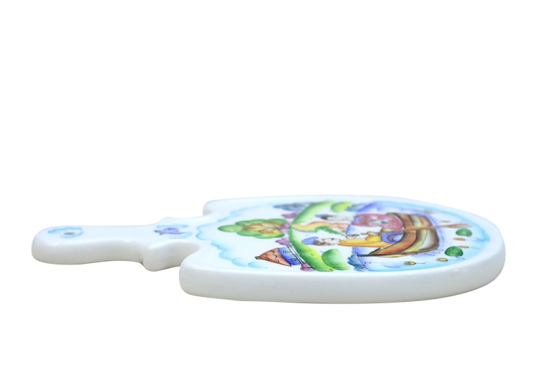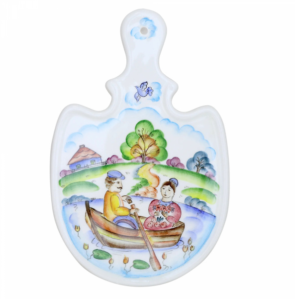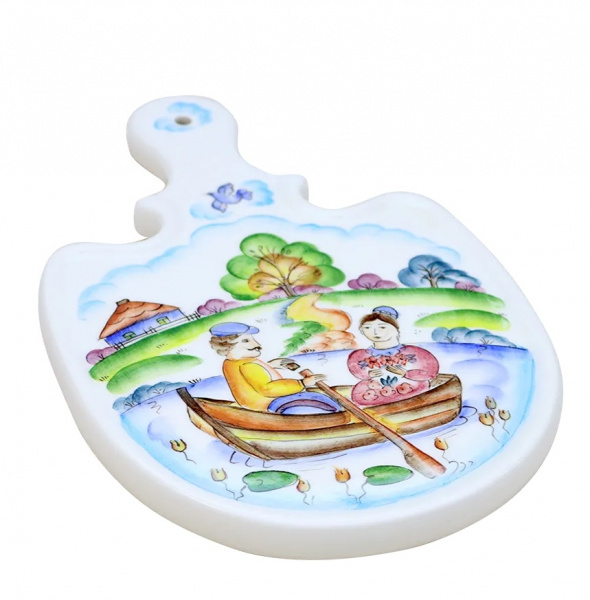 Изготовленная из высококачественной керамики, она отлично подойдет для нарезки и подачи сыра. Декорированная яркой, подглазурной, сюжетной росписью с изображением казака и казачки, плывущих на лодке, эта доска станет достойным украшением кухонного интерьера и желанным подарком каждой хозяюшки.