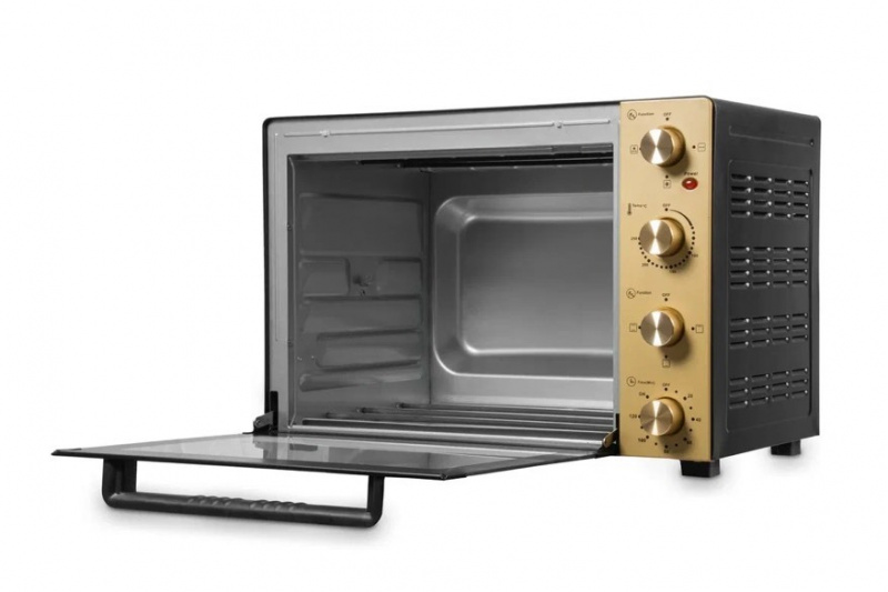 Электропечь способна готовить пищу с помощью 6 различных режимов, включая конвекцию и готовку на вертеле. Максимальная температура, которую позволяет настроить эта модель – 250º. Важной особенностью этой модели является интуитивно понятное диалоговое окно, на котором отображаются индикаторы работы и используемого печью режима приготовления пищи. В комплект входят прямоугольный противень для выпечки, круглый противень, решетка. Дополнительный противень для сбора крошек облегчает поддержание чистоты в духовом шкафу.