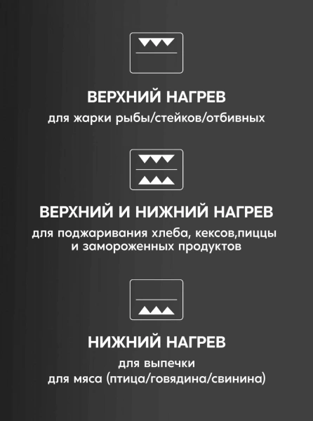 | Режимы духовки | нижний ТЭН, верхний ТЭН, Верхний + нижний нагрев, Верхний нагрев, Нижний нагрев |