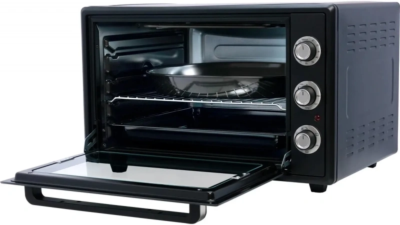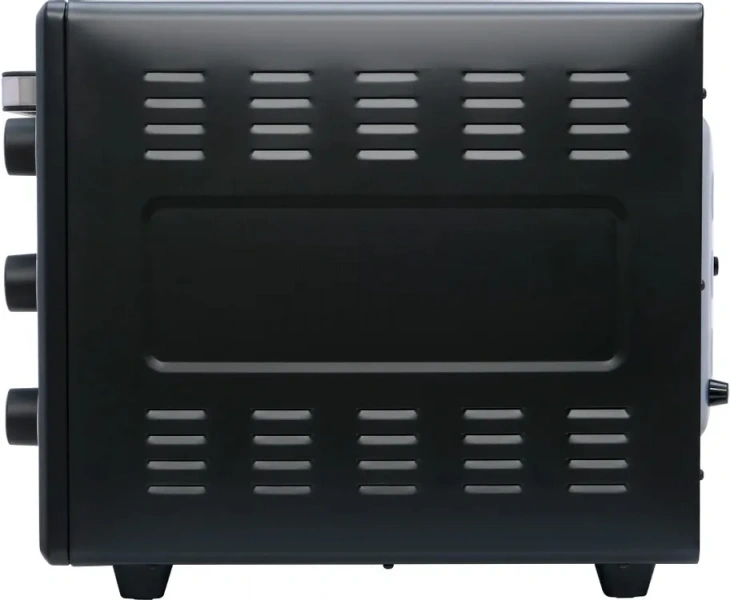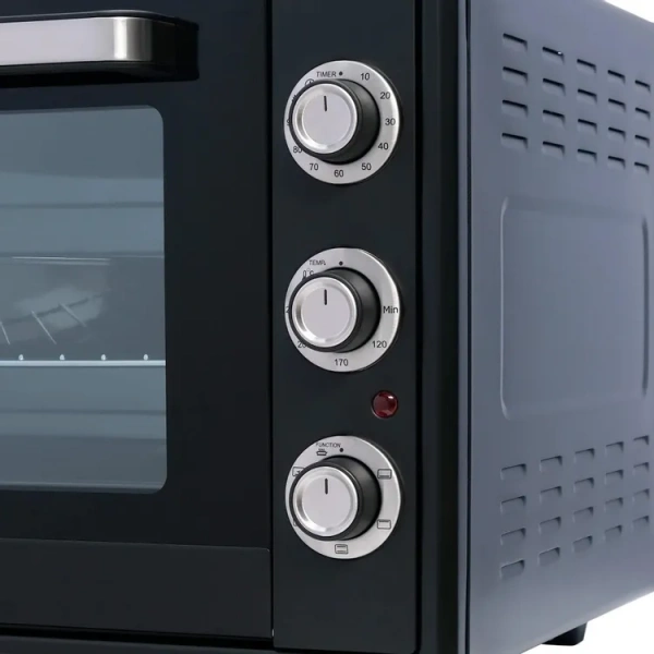 Интуитивно понятное механическое управление позволяет быстро настроить температуру, режим и время готовки. Устройство имеет пять режимов работы: нижний нагрев, верхний нагрев, нижний + верхний нагрев, верхний + конвекция, нижний + верхний + конвекция. Температура регулируется в диапазоне от 50 до 250°С. Конвекция обеспечивает равномерное распределение тепла, благодаря чему ингредиенты пропекаются равномерно. Благодаря таймеру можно установить время, необходимое для приготовления блюда. О работе мини-печи сигнализирует световой индикатор.