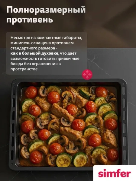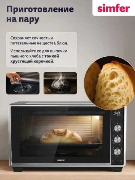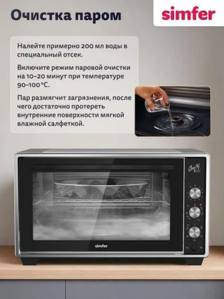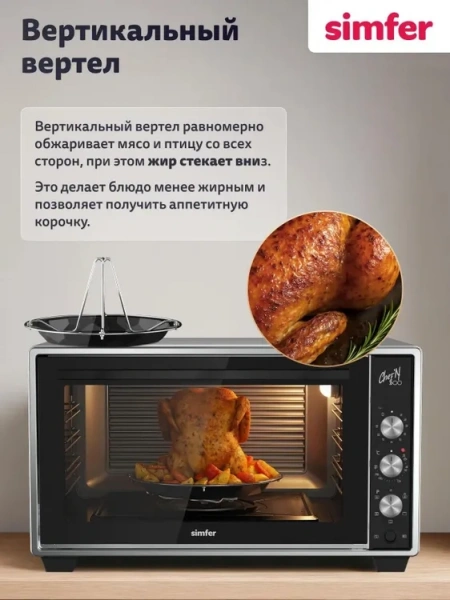 Мини-печь Simfer M50C25 объемом 50 литров и мощностью 1400 ватт. Имеет 5 режимов, в том числе конвекцию и гриль.