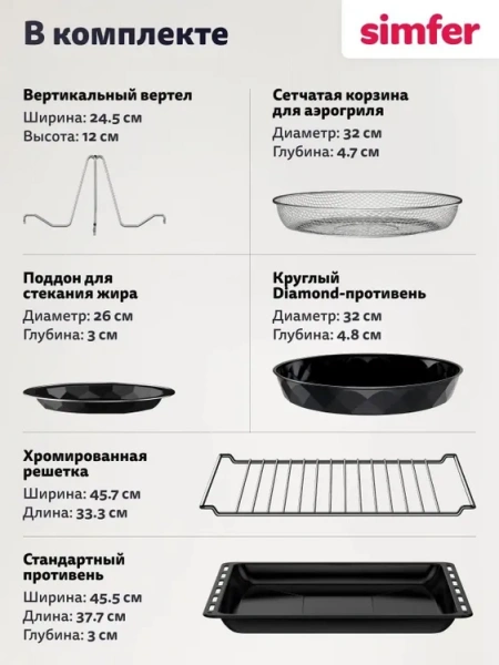 | Комплектация | Съемная решетка, Противень, Противень для гриля, Дополнительно в комплекте: хромированные направляющие специальный отсек для воды, круглый противень Diamond, вертикальный вертел, круглый Airfryer |