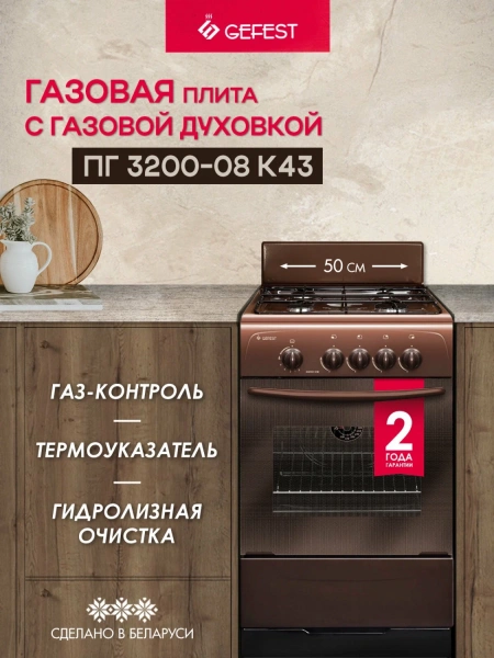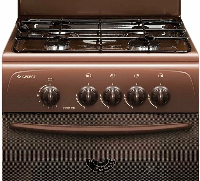 Газовая плита GEFEST ПГ 3200-08 К43 – это стильное коричневое оборудование с четырьмя конфорками и 42-литровой духовкой.