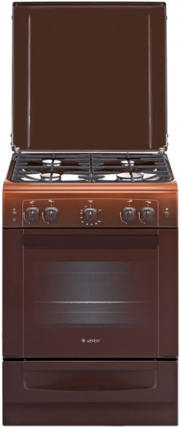 Удобная в ежедневной эксплуатации, замечательно смотрится на кухне. Газовые горелки зажигаются нажатием кнопки на панели, в духовке установлен газ-контроль. Варочная поверхность рассчитана на 4 конфорки, есть среди них большого диаметра, с быстрым нагревом. В качестве держателей для посуды предусмотрены чугунные составные решетки, задняя стенка защищена от брызг масла металлической крышкой.