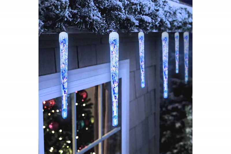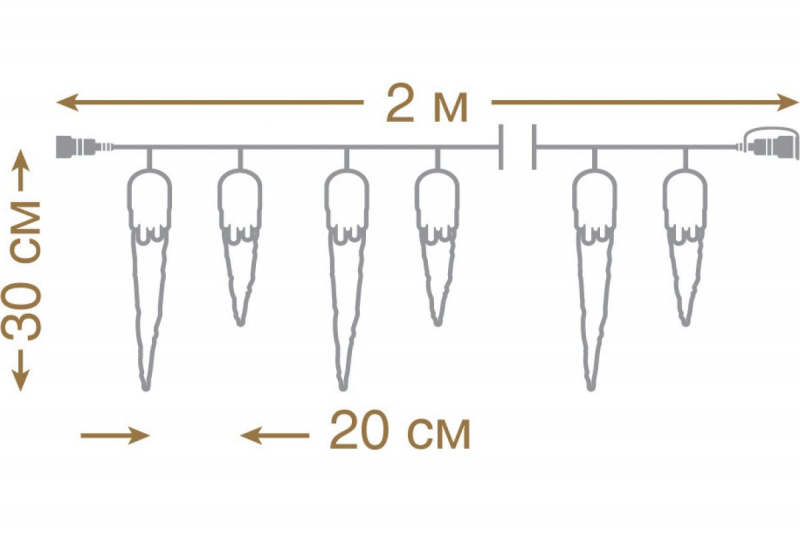 Размер гирлянды 2,7х0,3 м, количество светодиодов 40. Количество сосулек 10 (5 шт.-20 см, 5 шт.-30 см.). Цвет свечения холодный, режим свечения статичный, цвет провода прозрачный.