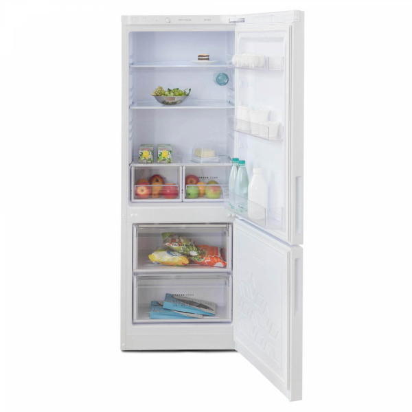 Холодильник с морозильником Бирюса 6034, классическим белым дизайном и общей вместимостью 250 л поставляется с масленкой, подставками для яиц и бутылок. Холодильная камера дополнена ящиком Humidity Control с контролем влажности, выполняющим функцию зоны свежести. Стеклянные полки легко переставляются для хранения высоких банок и кастрюль.