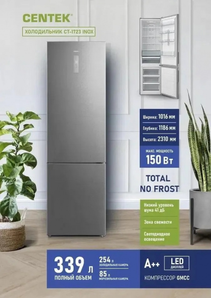 Холодильник Centek CT-1723 идеально впишется в интерьер кухни. Мощность подключения устройства составляет 150 Вт. При этом холодильник принадлежит к экономичной группе энергопотребления А++.