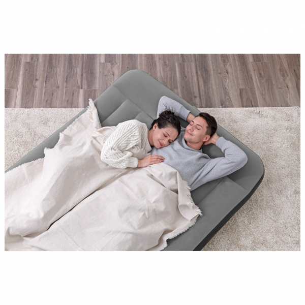 Когда нужно разместить гостей, но в доме нет лишнего спального места, вас выручит надувной матрас. На нём комфортно могут расположиться два человека. Прочные перегородки внутри матраса обеспечивают необходимую упругость. Встроенный насос упрощает процесс установки.