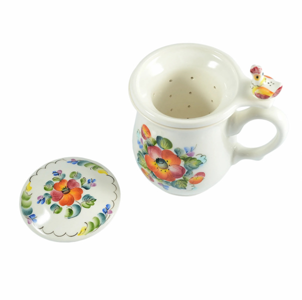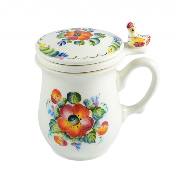 Очень удобная и функциональная кружка для заваривания трав и листового чая. Снабжена ситечком для заваривания. Любители свежезаваренного чая и травяных напитков оценят это изделие. В поездке или на работе - такая кружка может стать настоящей находкой. Яркая цветочная роспись и милая фигурка курочки на крышке кружки - создают добрый и теплый весенний образ.
