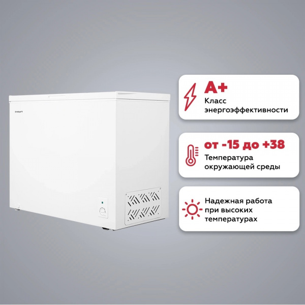 Устройство позволяет хранить большой объем продуктов питания длительное время. Благодаря лаконичной белой расцветке корпуса модель дополнит собой любой интерьер. Общий объем морозильного ларя достигает 280 л. Устройство имеет высокий класс энергоэффективности – А+. Для комфортного хранения продуктов в камере предусмотрена подвесная корзина. Мощность замораживания модели составляет 11,5 кг/сутки. Работа прибора сопровождается низким уровнем шума, не превышающим 41 дБ.