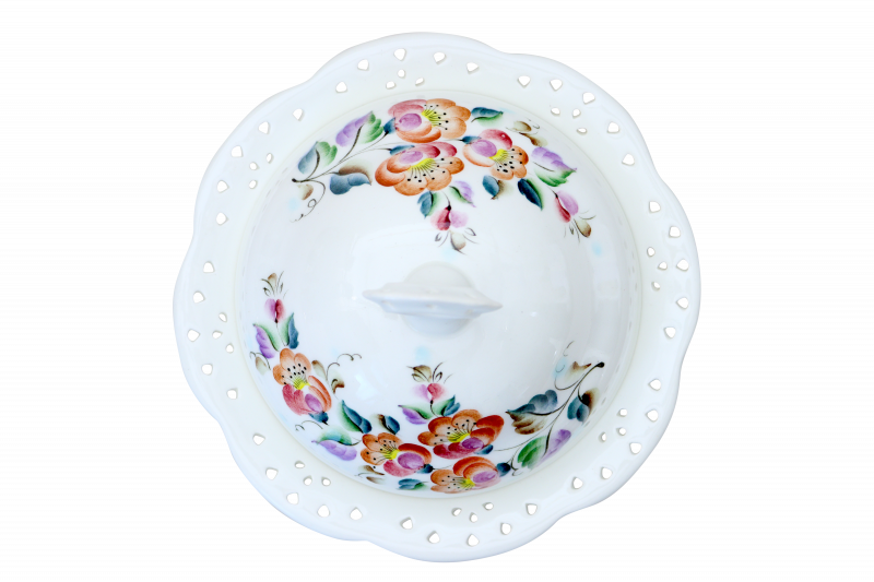 Рекомендуем обратить внимание на масленку "Каприз". Декорирована подглазурной росписью с изображением цветов, форма изделия необычна, хваток крышечки примечателен, такое изделие обязательно обратит на себя внимание. Является частью коллекции "Каприз". Ручная работа.