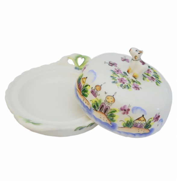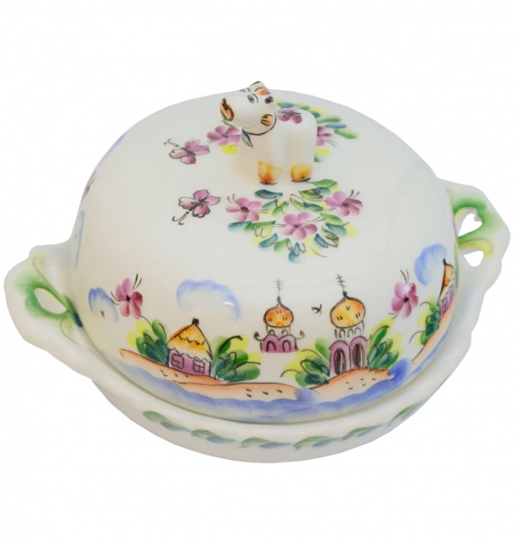 Для удобного хранения и красивой подачи сливочного масла рекомендуем обратить внимание на эту круглую масленку. Необычна форма масленки, по бокам изделия находятся удобные ручки-ушки. Сверху накрывается глубокой крышкой, украшенной вылепленной вручную фигуркой буренки. Декорировано изделие нежной цветочной росписью, а также изображением донских храмов.