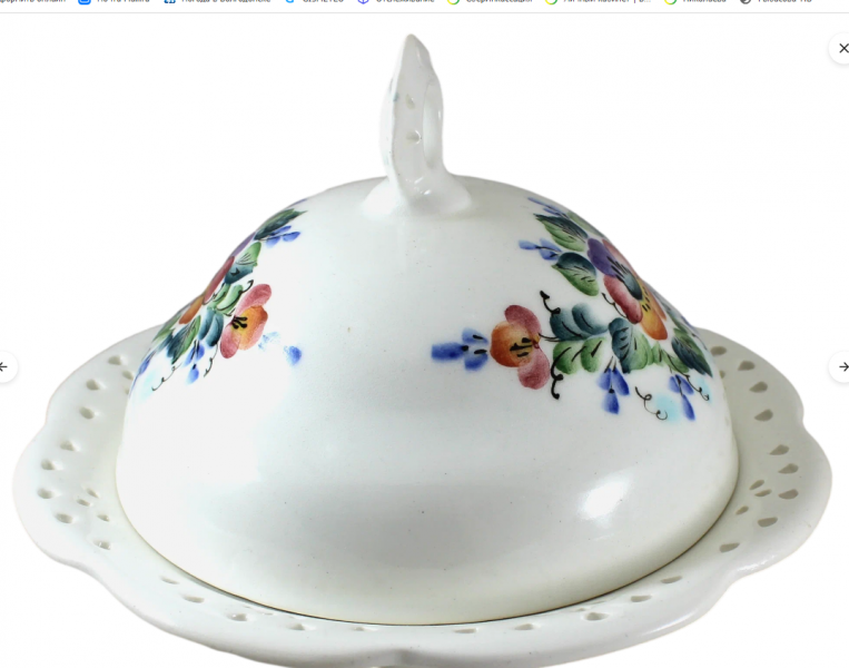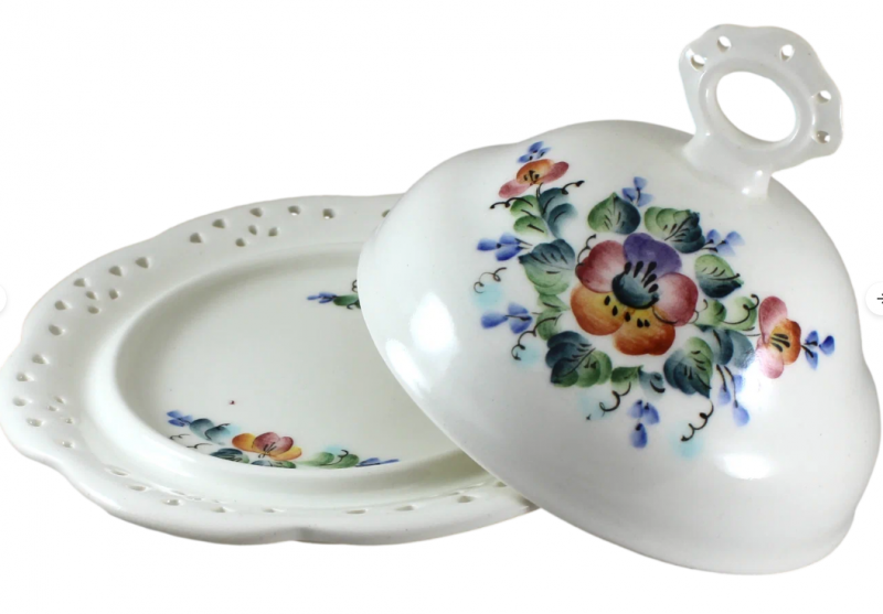 Для удобного хранения и красивой подачи сливочного масла рекомендуем обратить внимание на эту круглую масленку. Необычна форма масленки и примечателен хваток крышки - он украшен красивой, резной ручкой. Декорировано изделие нежной, подглазурной , сюжетной росписью с изображением донских пейзажей. Часть коллекции Ретро.